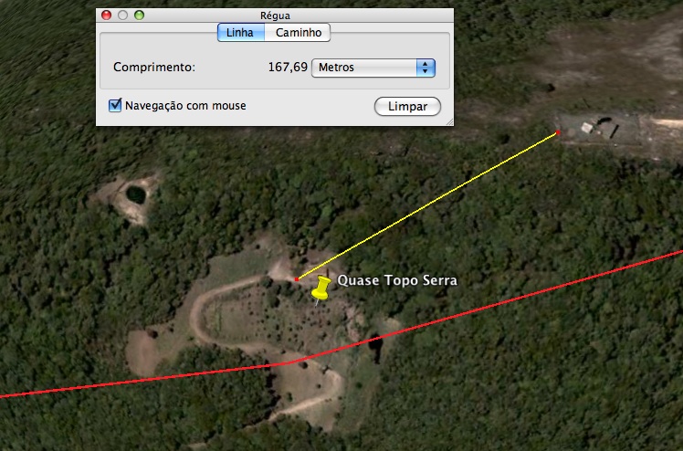 Foram 2 quilômetros até o topo num trajeto bem puxado. Chegando lá em cima iríamos tentar passar por uma parte da mata de uns 150 metros, conforme detalhe abaixo: